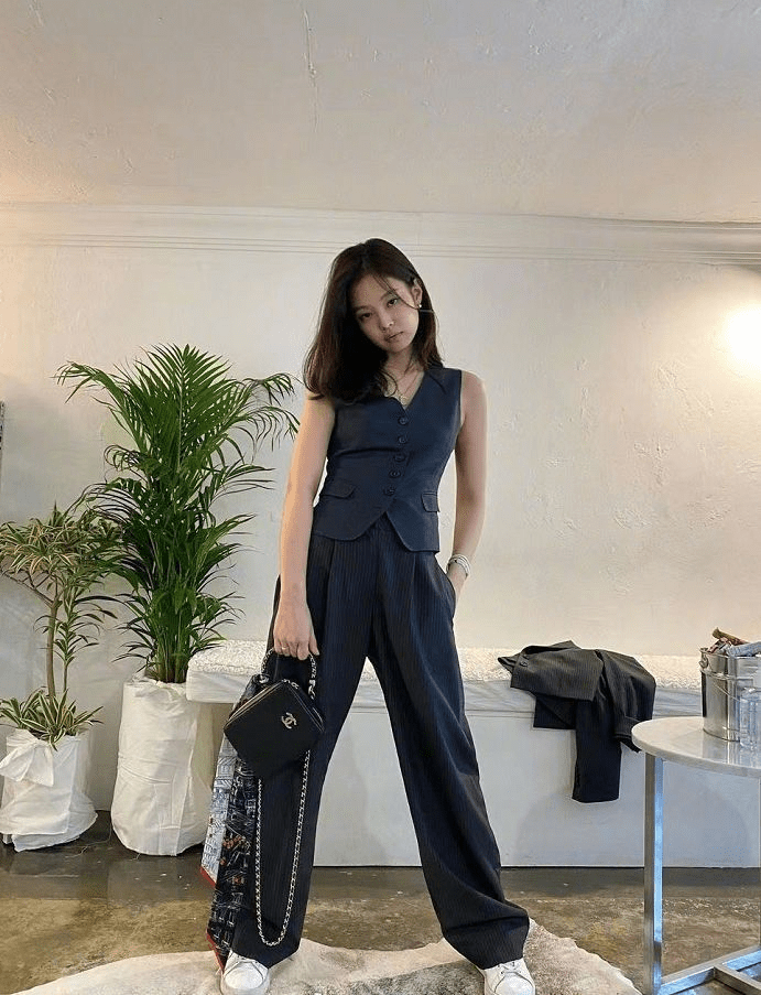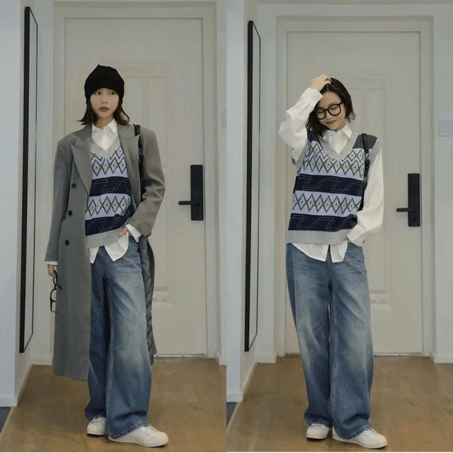 粉色的寬鬆毛背心穿起來給人傳遞出一種甜美又可愛的優雅形象,內搭白色襯衫,經典簡約,而且風格更為突出,褲子搭配一條寬鬆的牛仔褲,外搭一件粉色的寬鬆西裝外套,穿起來很顯白。