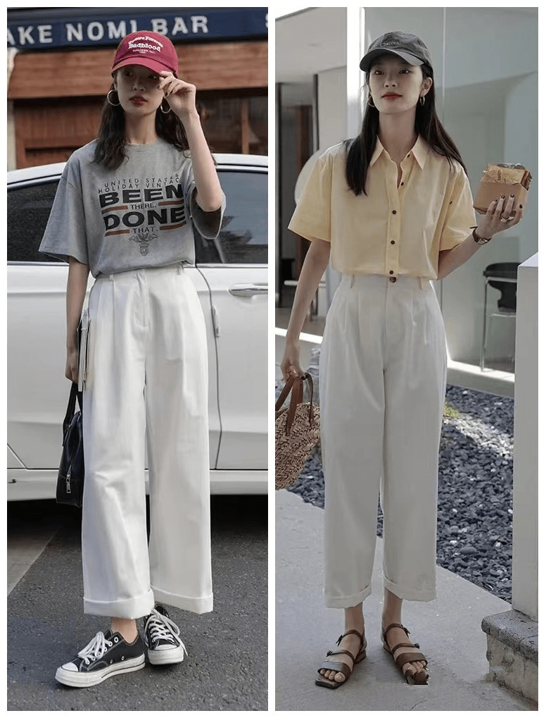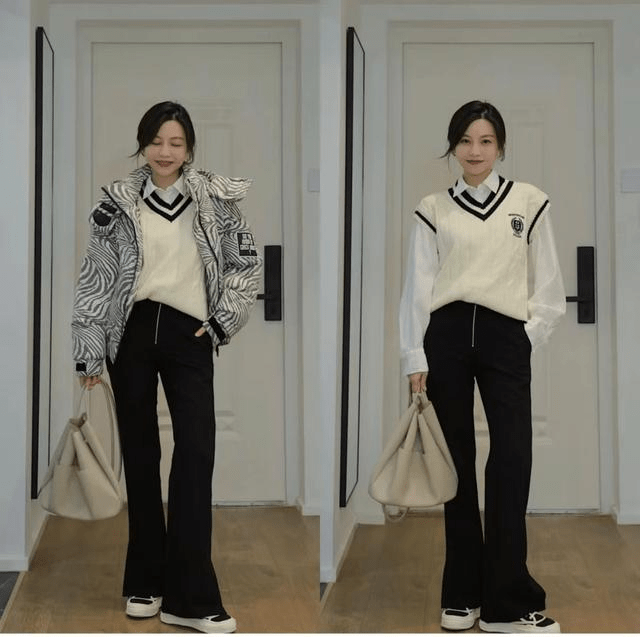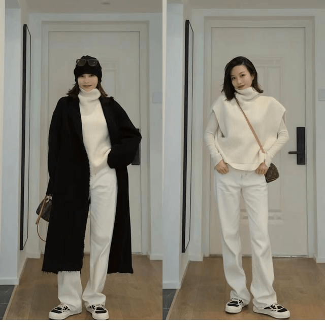 在很多人眼裡,黑白色系的穿搭給人的感覺更多的是大氣、帥氣,白色的高領毛背心內搭白色的打底衫,輕盈舒適。褲子搭配的也是白色的闊腿褲,非常溫柔,而且這樣的穿搭可鹽可甜,是很多人所喜歡的。