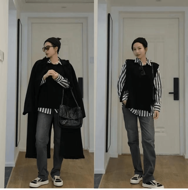 秋冬季節的毛背心穿搭可以起到很好的裝飾效果和保溫效果,黑色的毛背心能夠幫助女生穿出帥氣和炫酷的風格,毛背心內搭一件豎條紋的襯衫,簡約經典,不失個性。